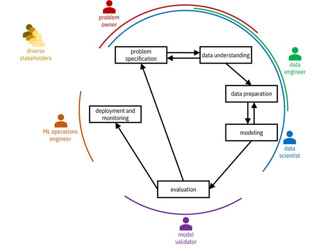 The different steps are carried out by different parties with different personas including problem owners, data engineers, data scientists, model validators, and machine learning (ML) operations engineers. Problem owners are primarily involved with problem specification and data understanding. Data engineers work on data understanding and data preparation. Data scientists tend to play a role in all of the first four steps. Model validators perform evaluation. ML operations engineers are responsible for deployment and monitoring.