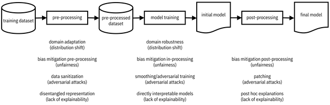 Figure 2.2. Main parts of trustworthy machine learning modeling. Distribution shift, unfairness, adversarial attacks, and lack of explainability can be mitigated using the various techniques listed below each part. Details of these methods are presented in the remainder of the book. Accessible caption. A block diagram with a training dataset as input to a pre-processing block with a pre-processed dataset as output. The pre-processed dataset is input to a model training block with an initial model as output. The initial model is input to a post-processing block with a final model as output. The following techniques are examples of pre-processing: domain adaptation (distribution shift); bias mitigation pre-processing (unfairness); data sanitization (adversarial attacks); disentangled representation (lack of explainability). The following techniques are examples of model training: domain robustness (distribution shift); bias mitigation in-processing (unfairness); smoothing/adversarial training (adversarial attacks); directly interpretable models (lack of explainability). The following techniques are examples of post-processing: bias mitigation post-processing (unfairness); patching (adversarial attacks); post hoc explanations (lack of explainability).