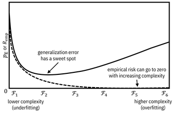 A very important concept in practicing machine learning, first mentioned in Chapter 2, is the no free lunch theorem. There is no one single machine learning method that is best for all datasets.[1] What is a good choice for one dataset might not be so great for another dataset. It all depends on the characteristics of the dataset and the inductive bias of the method: the assumptions on how the classifier should generalize outside the training data points. The challenge in achieving good generalization and a small error rate is protecting against overfitting (learning a model that too closely matches the idiosyncrasies of the training data) and underfitting (learning a model that does not adequately capture the patterns in the training data). The goal is to get to the Goldilocks point where things are not too hot (overfitting) and not too cold (underfitting), but just right.
