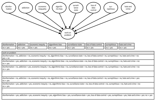 Figure 14.1. An example CP-net for whether Alma Meadow should work on the application evaluation problem. At the top is the graphical model. At the bottom are the conditional preference tables. Accessible caption. Eight nodes disinformation, addiction, economic inequity, algorithmic bias, surveillance state, loss of data control, surreptitious, and hate and crime all have the node work on problem as their child. All preferences for the top eight nodes are no ≻ yes. In all configurations of yeses and noes, the work on problem preference is no ≻ yes, except when all top eight nodes have configuration no, when it is no ≻ yes.