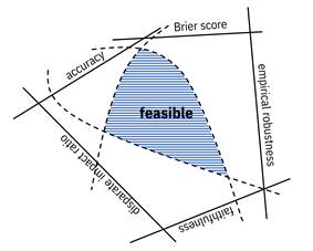 Figure 14.3. Schematic diagram of feasible set of trust-related metrics. Accessible caption. A shaded region enclosed by three curved segments is labeled feasible. It is surrounded by five axes: accuracy, Brier score, empirical robustness, faithfulness, and disparate impact ratio.
