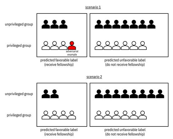 Figure 14.4. A pairwise comparison of illustrated scenarios. Accessible caption. Two scenarios each have different small numbers of members of unprivileged and privileged groups receiving and not receiving the fellowship. The first scenario also has an adversarial example.