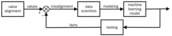 Figure 14.5. Transparent documentation and value alignment come together to help in the governance of machine learning systems. Accessible caption. A block diagram that starts with a value alignment block out of which come values. Facts are subtracted from values to yield misalignment. Misalignment is input to a data scientists block with modeling as output. Modeling is input to a machine learning model with output that is fed into a testing block. The output of testing is the same facts that were subtracted from values, creating a feedback loop.
